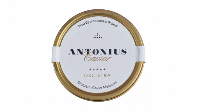 Kawior biały Antonius Oscietra pochodzi z dojrzałych samic jesiotra rosyjskiego hodowanych w krystalicznie czystych wodach Warmii i Mazur. Charakteryzuje się dużymi, jędrnymi ziarnami o barwie od oliwkowej, przez bursztynową, aż do jasnobeżowej. Smak kawioru jest subtelnie orzechowy, z nutą masła i morskiej świeżości, a tekstura aksamitna i jedwabista. Kawior powstaje według tradycyjnej metody Malossol, z minimalną ilością soli, co pozwala na zachowanie naturalnego aromatu i wartości odżywczych. Produkt jest ręcznie pakowany i selekcjonowany, aby zapewnić najwyższą jakość. Biały kawior to wybór dla koneserów szukających luksusu i wyjątkowych doznań smakowych.